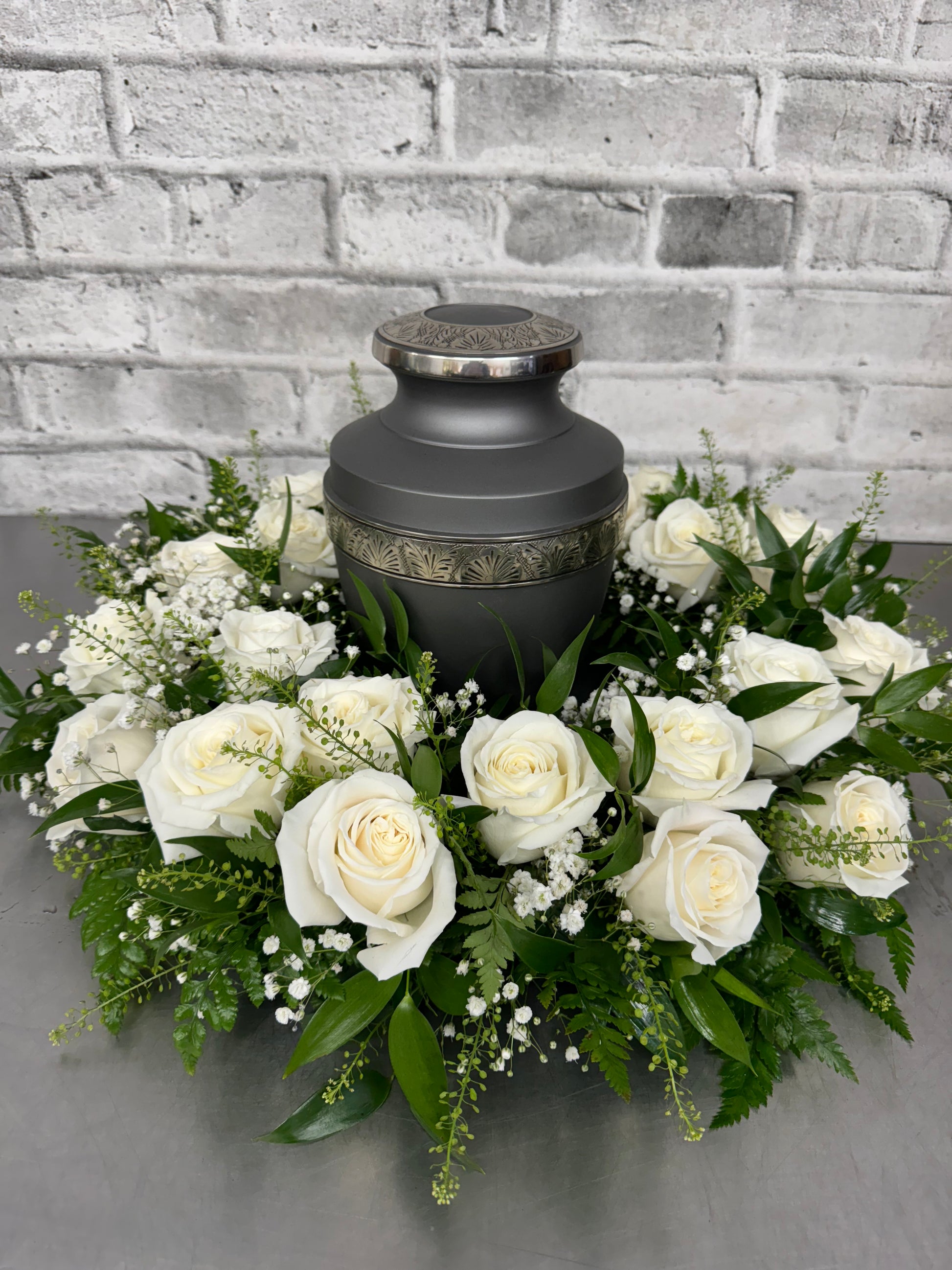 Classic white roses with babies breath and greenery to surround your loved ones urn.